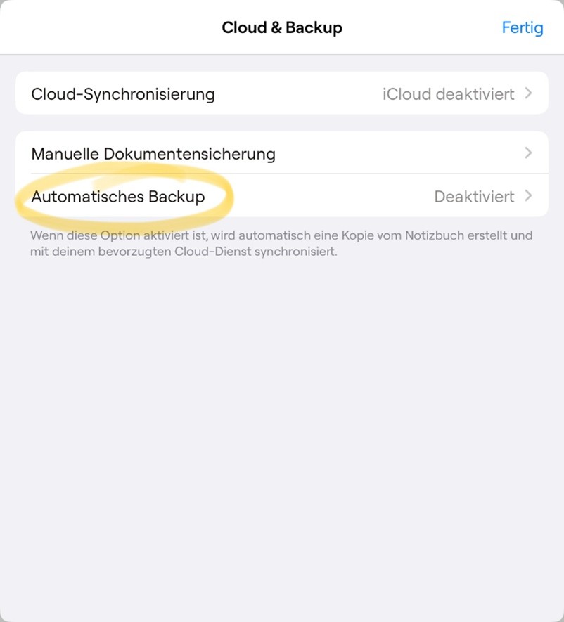 • Tippe auf „Automatisches Backup“, um die Backup-Funktion zu aktivieren.