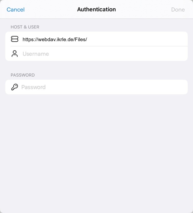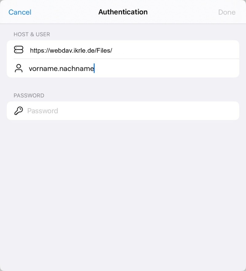 • Wenn die IServ-App auf deinem Gerät installiert ist, sollte die WebDAV-Adresse automatisch im ersten Feld eingetragen sein.
